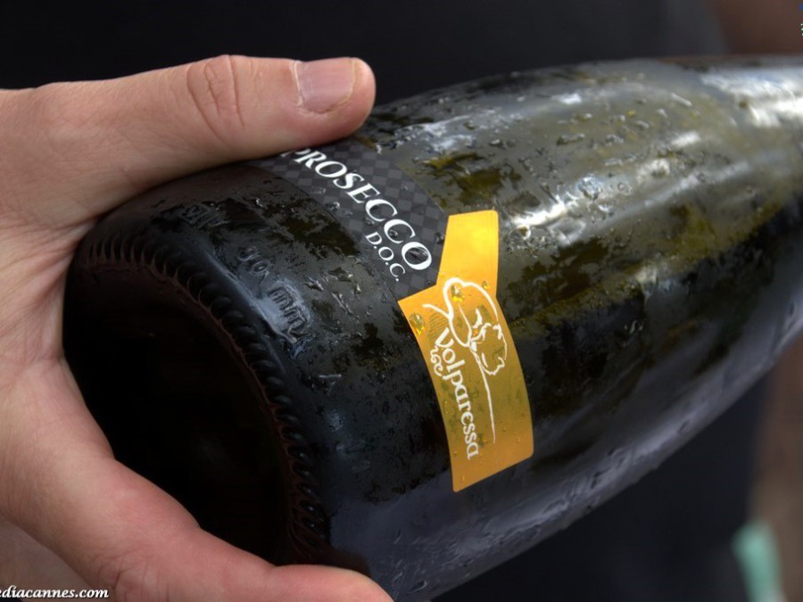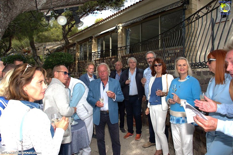 Vêtus de bleu azur, les convives se retrouvent sur la terrasse face à la Méditerranée et dégustent un prosecco accompagné de canapés salés. Ambiance chic et conviviale entre ciel et mer.